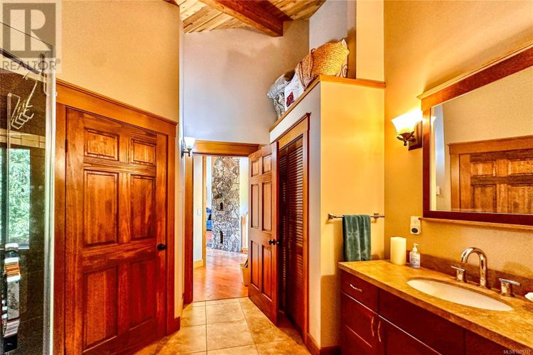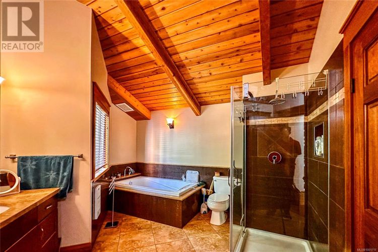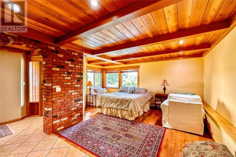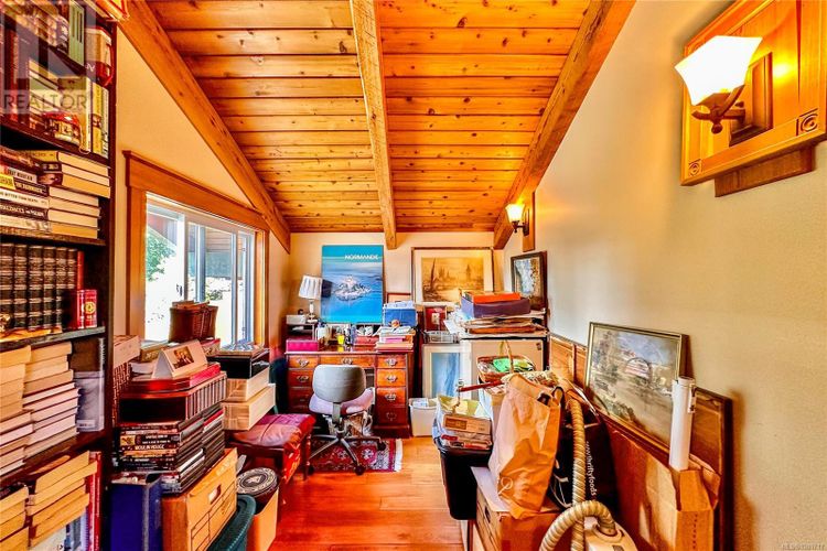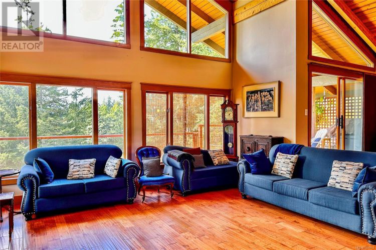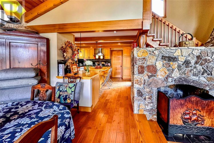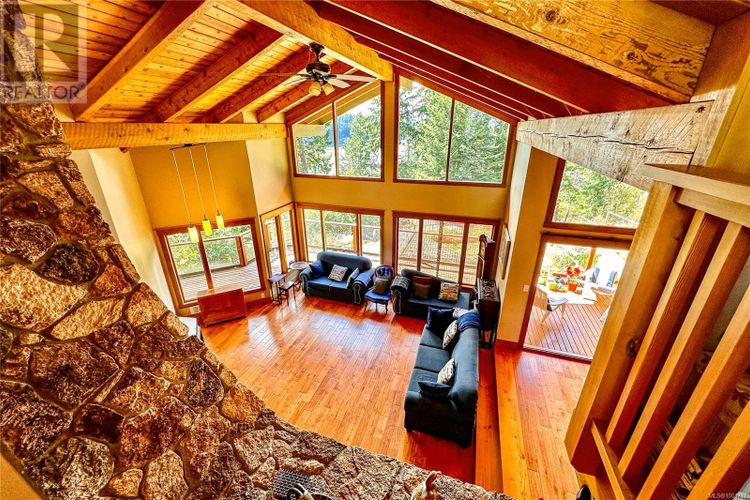 Remarkable ocean-view home overlooking Gowlland Harbour on Quadra Island's west side. This beautiful family residence features post and beam construction with high vaulted ceilings, blending seamlessly with its natural surroundings, including a towering arbutus tree in the front yard and stunning rockwork around the gardens. The lower level offers a spacious family room with a wood stove and original brickwork, a bedroom, and a guest suite with a four-piece bathroom and private deck, ideal for a B&B. Stairs lead up to the main level, which boasts a spacious open floor plan. The kitchen features oak cabinets, a custom wood island, tile flooring, and stainless steel appliances, with a door opening to a side deck that wraps around the back of the home. The dining room has a sliding door to the large front deck, and the sunken living room features a floor-to-ceiling rock fireplace. The master bedroom on the main level includes a walk-in closet, a sliding door to the front deck, and a four-piece ensuite. The upper level features a loft area currently used as an office space and another bedroom. This home showcases beautiful wood finishes and custom tile work throughout. Additional amenities include an attached garage/workshop at the front and a detached storage shed in the backyard. Situated on a beautifully landscaped, fully fenced 0.4-acre lot with a sunny westerly exposure, established garden beds, and fruit trees, this property is midway between Quathiaski Cove and Heriot Bay. It offers easy access to all services: a five-minute drive to either location and less than a five-minute walk to a marina. (id:26452)