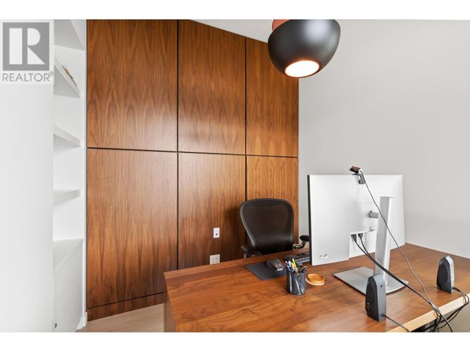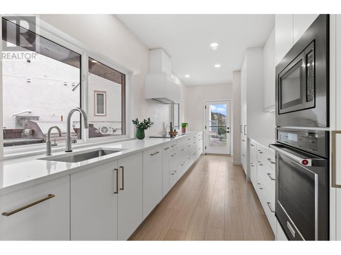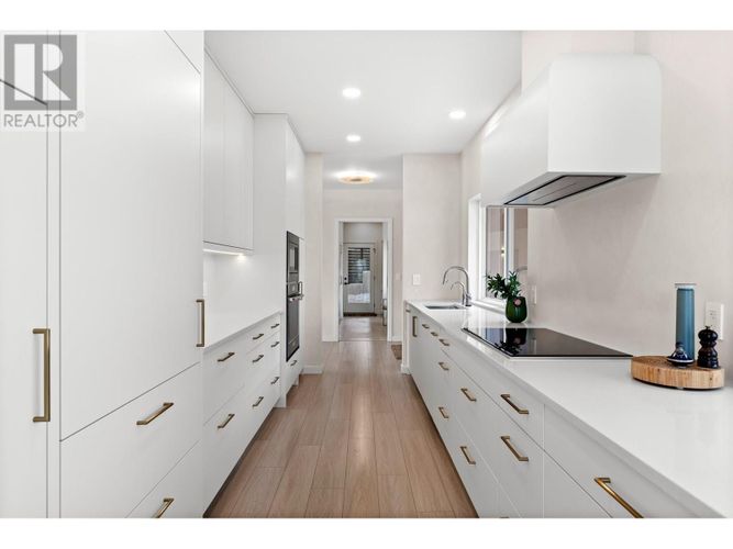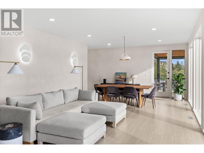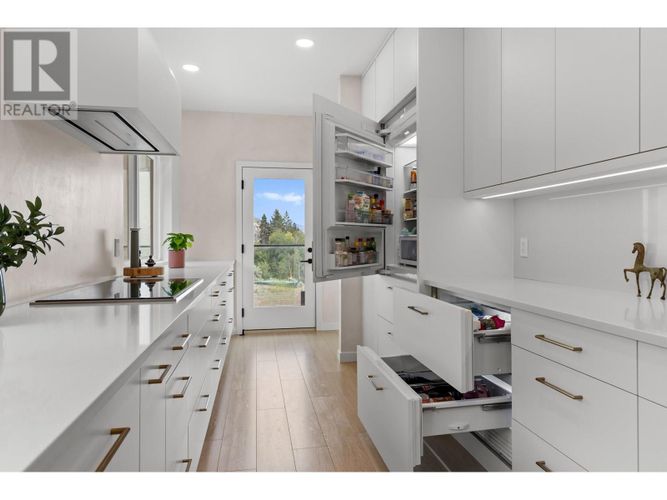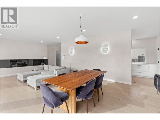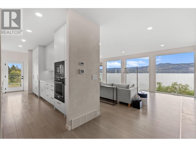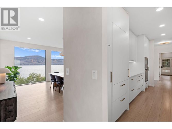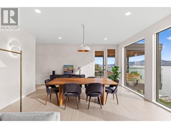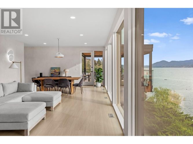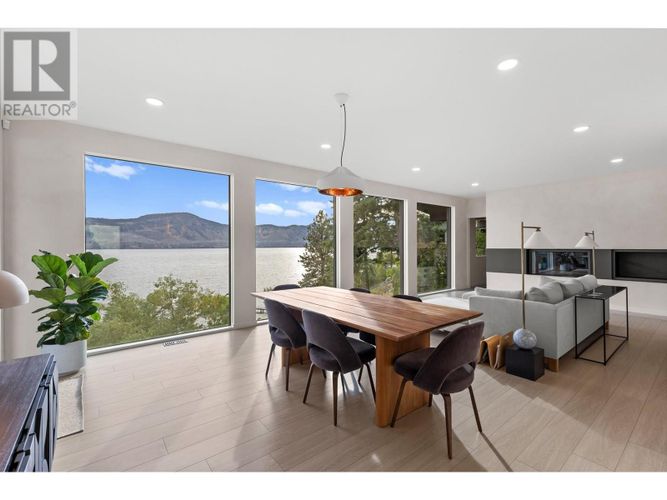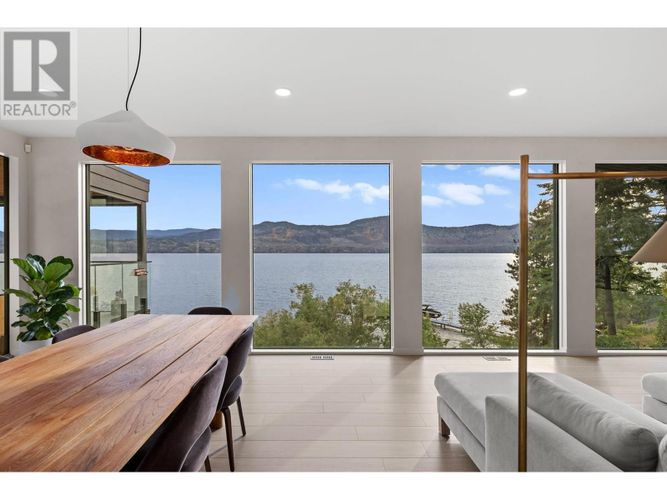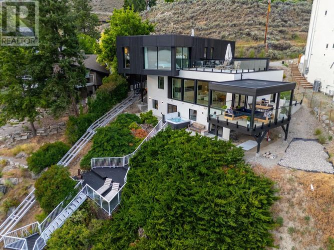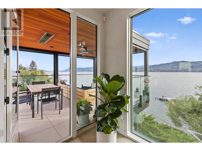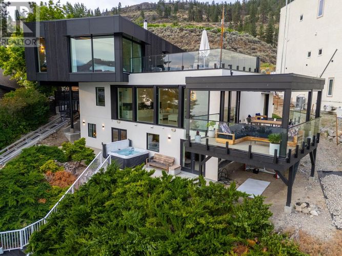 Custom-built by the award-winning Ritchie Custom Homes, this striking modern residence is artfully tucked into the beauty of Indian Rock in Naramata, where the mountains meet the lake. Set along approx. 94 feet of crystal-clear shoreline, the home is harmoniously nestled into the rolling hills, mature pines and natural landscape of the Okanagan. Immersed in nature yet only minutes from top wineries and restaurants like Poplar Grove, Moraine, Joie Farm and the iconic Naramata Inn, the property offers the perfect balance of seclusion and accessibility, 30 minutes from Penticton Regional Airport. Spanning 3,354 square feet across three levels, the home includes four bedrooms, a dedicated office and a self-contained garden suite ideal for guests or extended family. Floor-to-ceiling windows flood the interior with natural light and frame uninterrupted southwest views of Okanagan Lake and the surrounding mountains, creating a seamless connection between indoors and out. The open-concept living and dining areas showcase natural finishes including soft oak-toned wide plank flooring, Venetian plaster walls and curated lighting. A sleek wood-burning fireplace brings warmth and character, perfect for quiet evenings immersed in the zen of lake and mountain vistas. The main level opens to a covered patio complete with a recessed heater and automated solar shades for year-round enjoyment. A fully-equipped outdoor kitchen sits just steps from the main kitchen, allowing for effortless al fresco dining surrounded by nature. The primary suite is a true retreat, offering access to a private rooftop terrace where panoramic views stretch across forested hills and open water. The spa-inspired ensuite features a steam shower and Japanese-style water closet, adding serenity and calm to your everyday routine. A level lakeside yard leads to a shared dock with two dedicated lifts, easily accessed via a private powered tram making lakefront living as effortless as it is beautiful. (id:26452)
