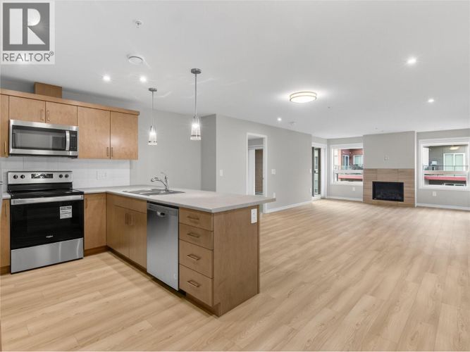 This BRAND NEW and finished, two bedroom plus a den unit is ready to move into and enjoy! Located on the 10th floor facing West, this efficient and spacious middle suite enjoys lake views, two decks, and 1183sqft. The main living area is a large open plan design with a maple shaker style kitchen, large dining area, and huge living room complete with a gas fireplace and patio doors out to the two decks! There is a large den perfect for a home office, a spacious second bedroom and a full guest bathroom, plus a large primary suite complete with a walk in closet, patio doors to the deck, and an ensuite bathroom with double sinks and a large shower. This brand new concrete and steel building is located just a short walk to Skaha Lake beach and parks and all the awesome trails and outdoor amenities it offers. The unit comes with a secure parking spot in the parkade and a storage locker located conveniently on the same floor as the suite! This complex is not only a stroll to the beach but other great amenities like Kojo Sushi, a bakery and pizza place, convenience stores, the Dragon Boat Pub, and fitness places like SpinCo! All appliances are included and NET GST is included in the purchase price! With no age restriction and two pets allowed this strata offers great flexibility! Long term rentals allowed no short term. (id:26452)