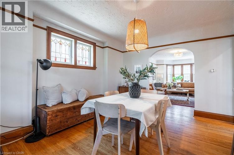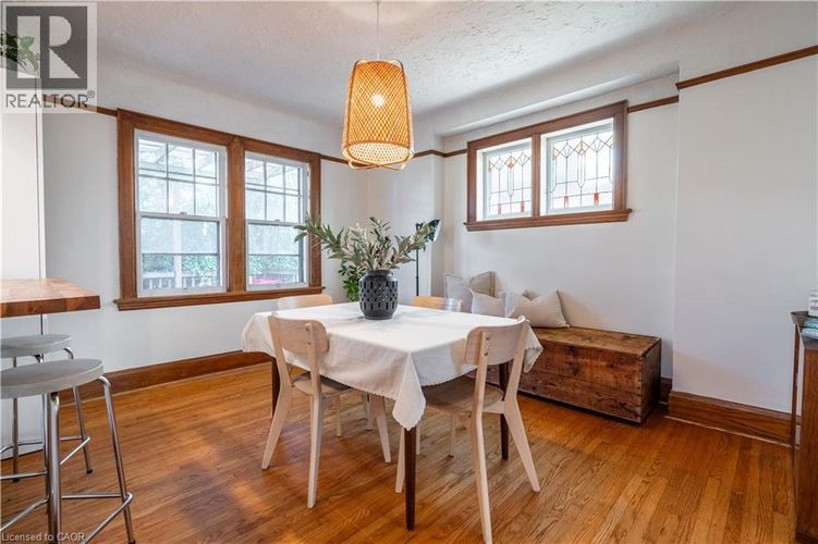 Welcome to 26 Weir Street South, a charming and character-filled 1.5 storey brick home offering1,326 sq ft of move-in ready living space. From the moment you step inside, you'll be captivated by the timeless original woodwork, including the elegant staircase, classic bannisters, solid wood doors, and vintage baseboards that echo the home's historic charm. Stunning stained glass windows in both the foyer and dining room add a unique touch of elegance and warmth. The main floor features a spacious living room with a large bay window that floods the space with natural light. The formal dining room is perfect for hosting, while the bright eat-in kitchen includes a breakfast bar for casual meals and conversation. Sliding patio doors lead to a generous covered deck, ideal for entertaining guests. Step outside to a private, fully fenced backyard, a tranquil and beautifully landscaped retreat. Whether you're relaxing with a morning coffee, hosting a summer barbecue, or letting the kids play freely, this peaceful outdoor space offers something for everyone. Upstairs, you'll find three comfortable bedrooms and an updated 4-piece bathroom. The basement adds even more living space with a cozy rec room, a 2-piecebath, and a separate side entrance, offering in-law suite or rental potential. A paved driveway with parking for up to three vehicles, leads to a detached single-car garage with hydro, perfect for a workshop or man cave. Located in a friendly, family-oriented neighbourhood just steps from Montgomery Park, and close to schools, restaurants, shopping, and public transit. Quick highway access makes commuting to Toronto or Niagara a breeze. Don't miss your chance to own this beautiful, well-maintained home, its full of character, comfort, and charm. Book your showing today! (id:26452)