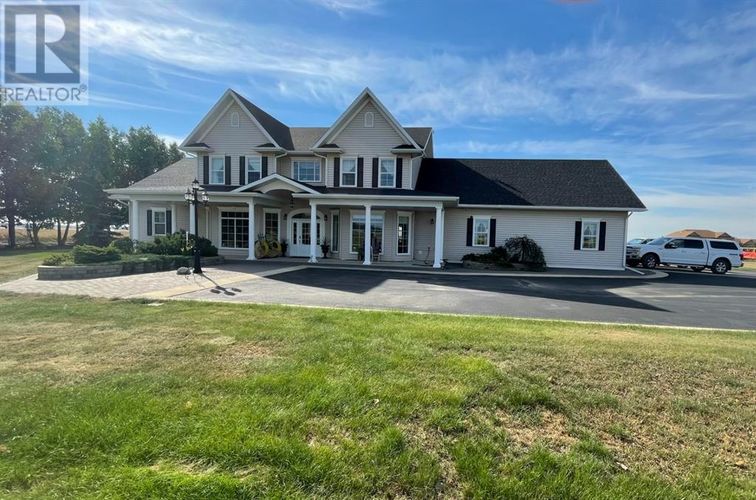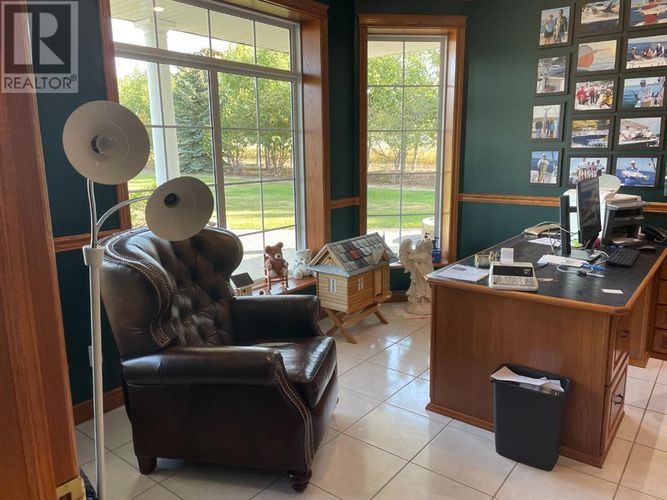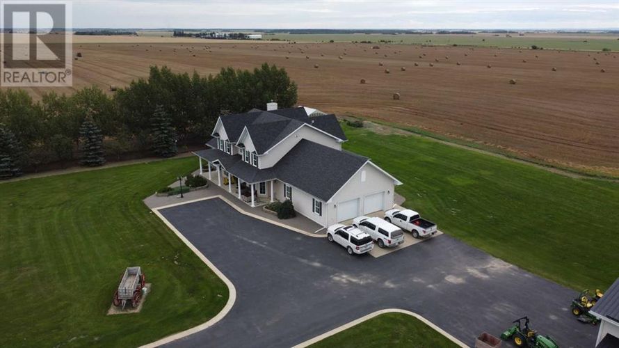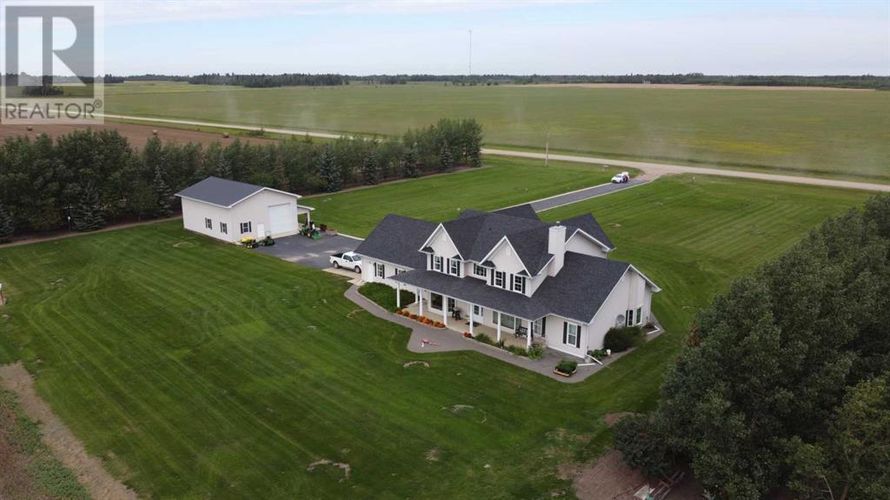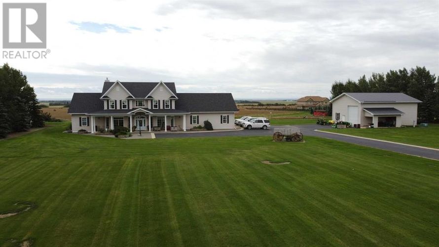 The envy of acreage living! An Absolutely Beautiful Country Estate! Custom built in 2005, this property satisfies most desires plus! Located within 3 minutes of town and is set up with municipal water. Enjoy the peace of mind with this newer construction and the practical well thought out layout of this property. The home offers a gorgeous kitchen with custom built-in features to hide your kitchen equipment while still being ready for use in a flash; and is outfitted with a garburator and an instant hot water tap. The breakfast nook is surrounded with natural light and overlooks the back yard and the farm fields beyond. The formal dining room is conveniently located next to the kitchen and is sure to impress your guest. Then retire for the evening in the large living room outfitted with a wood burning fireplace and visit the night away. Get your beauty sleep in the master suite after soaking in the large bathtub which is part of the 5-piece master ensuite. Work from home in comfort in the large naturally lit office. The laundry room is conveniently located on the main level and is outfitted with sinks and cupboards. Plus the main level is fully wheelchair accessible. The upper level host 3 additional large bedrooms (one currently serves as a craft room) and a 3-piece bath, along with a theatre room, a play room, a sitting area and storage. The utility room can be accessed from the 24' x 30' heated attached garage. The home is both heated and air conditioned with a Geothermal system for year round comfort. There is also a 34' x 44' shop featuring a 16' ceiling and a 14'H x 12'W overhead door, wired and partially insulated. The driveway is compacted and paved for high weight capacity and leads right up to the house as well as to the shop. There is a garden as well as a greenhouse. This is an incredible opportunity! Call your Realtor for an appointment to view.
