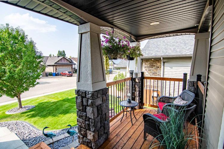 Pride of ownership in this upgraded, executive-built two storey home located on a quiet Close. The curb appeal is highlighted by a welcoming covered front veranda, with the front stairs rebuilt in 2023. Inside, the open-concept floor plan showcases a two-toned maple kitchen with crown moldings, full tile backsplash, a raised eating bar island, and a convenient walkthrough pantry. The appliances have been updated in recent years, complementing the timeless design. The dining area offers access to the deck with a BBQ gas line and the landscaped backyard with an irrigation sytem for easy watering, while the living room features a cozy gas fireplace and hardwood floors, main floor was recently painted as well (January 2025). The laundry has been relocated to the basement, but main floor hookups remain available in the mud room if desired. Upstairs, a spacious west-facing family room fills with natural light and captures incredible sunsets and gives mountain views on clear days. The king-sized primary suite offers a beautifully renovated 4-piece ensuite with double sinks and a tastefully designed oversized shower. Two additional bedrooms and a 4-piece bathroom complete the upper level. The basement is open for future development, already pre-plumbed for in-floor heating and a fourth bathroom, with space for additional bedrooms and a finished flex/gamers paradise room. Recent updates include fresh paint throughout (including ceilings), upgraded carpet with premium underlay, and replacement of all upstairs windows (around 2020–21). Major maintenance items have also been addressed with new shingles (2024) and a new hot water tank (2024), ensuring peace of mind for years to come. The exterior is equally impressive, featuring curbed landscaping, a concrete patio, and a repainted fence (2021), all contributing to a finished and well-cared-for outdoor space. Completing the property is an oversized 24X26 heated garage with in floor drains. A well cared for property ready for new owners! (id:26452)