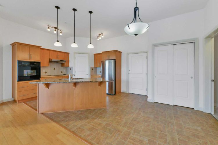 This Brava unit is one of the very few homes that was purchased at the build stage, giving the original owners the ability to customize it specifically for long term accessible living. On the 4th floor you get 10’ ceilings(!), the larger window package unique to the top level, 7’ doors, and an east facing deck with a gas hookup. The kitchen was upgraded at construction with roughly $20,000 in improvements, including maple Westridge cabinetry, a granite island, automatic lighting, durable laminate counters, and many drawers. The primary suite was intentionally designed for mobility and comfort, complete with a walk-in shower, dual vanities, and a heavy duty comfort height American Standard toilet; need a comfortable tub? Find the 6' tub in the main 4pc bathroom. Bamboo flooring, centralized A/C, and the energy efficient fan coil system keep the home easy to live in. The building adds meaningful convenience with a theatre room, games room, full fitness room, rooftop terrace, heated underground parking, and clean, contemporary common areas. Additional parking on the north side of the building - parking pass included. No doubt you'll find that this home was planned properly from the very beginning, with accessibility built in rather than added later - no DIY work, no retrofits needed. No pet home! If you’re looking for a place already set up for ease, safety, and day to day comfort for you or your family members, this is one of the best opportunities where the important work is already done. (id:26452)