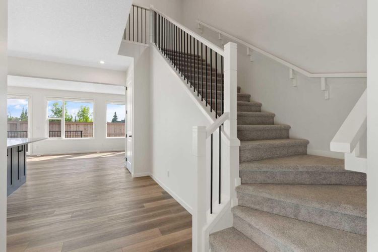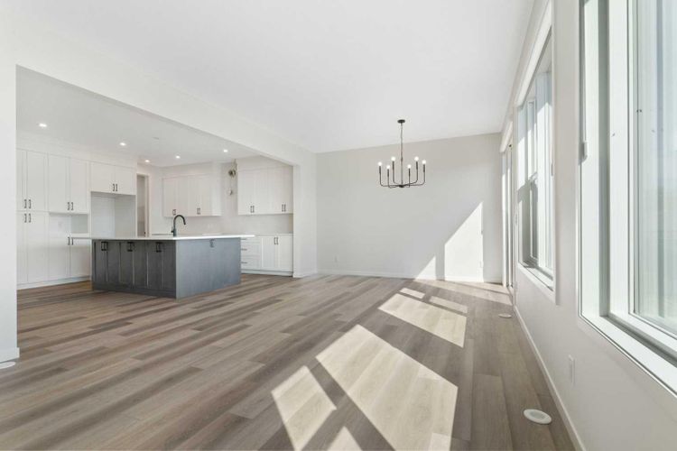 From the moment you step inside the Elbow by Cedarglen Homes, you feel it - this is a home designed for connection, comfort, and possibility. With over 2300 square feet of thoughtfully crafted living space, every detail balances style and function for the way modern families live today. The main floor welcomes you with an open flow that makes gathering effortless. At the heart of the home, the kitchen anchors the space with its striking two-toned cabinetry - bright white along the perimeter contrasted by a bold, dark island that doubles as a casual dining hub. Sleek black hardware, upgraded quartz countertops, and a central island invite conversation while meals are prepared. As the buyer of this home, you'll get to choose your own appliances at the builder's supplier with an allowance of $8954. Just beyond, the great room glows with the warmth of an upgraded fireplace tile feature, while the dining nook spills seamlessly onto the deck - perfect for summer nights spent entertaining under the stars. What sets this home apart is the versatility of a main-floor bedroom tucked just off the foyer. Whether for overnight guests, aging parents, or as a private home office, it offers comfort and convenience rarely found at this price point. A nearby powder room completes this welcoming main level, with the front-attached garage adding everyday practicality. Upstairs, the layout shines for family living. The primary suite is a retreat all its own, privately positioned at the back of the home with a spa-inspired ensuite featuring dual sinks, a walk-in shower, and a generous walk-in closet. Two additional bedrooms at the front share a full bathroom, while a central bonus room creates a flexible hub for movie nights, homework, or quiet reading. Laundry is also upstairs exactly where you need it most. The basement is unfinished with a side entrance - waiting for your creative touch. Set in the prestigious community of West Grove Estates in Calgary’s West District, this home pairs timeless design with an address that truly elevates your lifestyle. Tree-lined streets, nearby parks, and top-rated schools create a sense of community, while shopping, dining, and easy access to downtown or the mountains make every day more convenient and more inspiring. With finishes like warm luxury vinyl plank on the main floor, cozy carpet upstairs, and designer accents throughout, the Elbow is built not just to live in, but to grow into - a place for milestones, memories, and everything in between. Don’t just imagine the lifestyle, come experience it. The Elbow at West Grove Estates is ready to welcome you home. *Some photos are virtually staged* (id:26452)