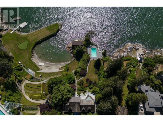 WEST VANCOUVER'S FINEST WATERFRONT ESTATE is situated on a level 1.58 acre S/W facing low bank private property with over 300 ft of oceanfront and private sheltered sandy beach in a setting that is simply magical! The main home offers approx. 8000 sq/ft of living in addition to a 2 bedroom coach house and private beachside studio. Huge primary rooms with wide open kitchen, family, living, and dining areas all open to the terraced patios flowing out to the sprawling lawns and tranquil gardens connecting to the stunning poolside setting on your private peninsula of property. The traditional grand floor plan features 6 bedrooms, 8 baths, a stunning master suite with glorious balconies overlooking the expansive estate, and close-in island views that go forever! One-of-a-kind World Class Dream!