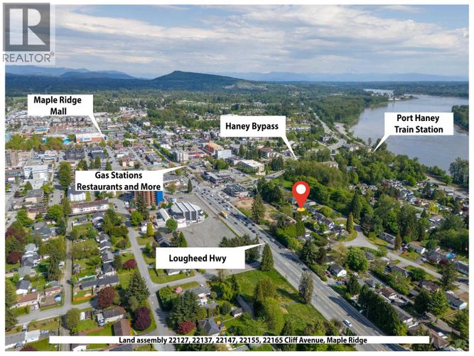 LAND ASSEMBLY in downtown Maple Ridge! Recent OCP amendment supports Low Rise Apartments 4-6 stories. Located within the Lougheed Transit Corridor and just outside the outer of the Transit Oriented Area. FSR up to 2.5 (includes bonus density) and all service at lot line or nearby. Situated on a quiet dead-end street, with lane access and the top floors will have unobstructed views of the Fraser River! Only steps from the West Coast Express, downtown Haney which includes shopping, restaurants, recreation and more! To be sold as a package with 22119, 22127, 22137, 22147 and 22165 Cliff Ave. Package price $11,999,400. Private showings only! Do NOT walk on the properties without an appointment. (id:26452)
