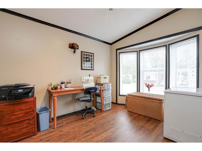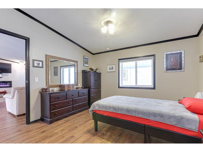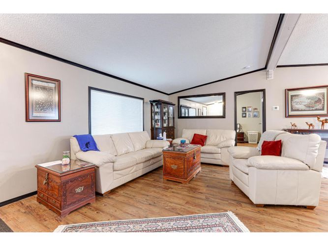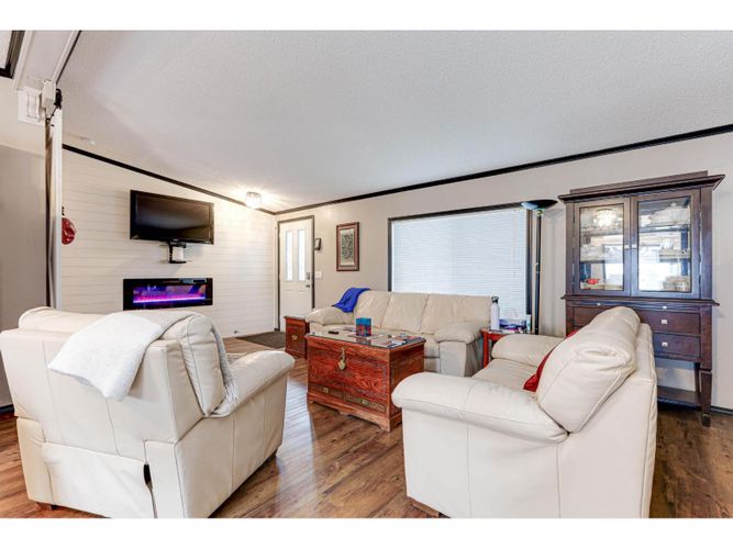 Welcome to this beautifully updated 3 bedroom, 2-bath, double-wide mobile home, with a Brand New Roof in 55+ park, and located on a quiet dead-end street. This home combines modern amenities with a peaceful setting, ideal for comfortable living. The open floor plan includes vaulted ceilings, an electric fireplace, stylish barn doors, natural gas stove, and heat pump/air conditioning. Durable laminate flooring throughout adds elegance. Outside, enjoy a large covered deck with natural gas hook-up for your BBQ, large 10x12 storage shed with 110/220 power, and raised garden bed. The low-maintenance yard ensures easy upkeep. Small dogs welcome with park approval, but sorry no cats. Close to shopping and recreation areas. Definitely worth viewing. Call REALTOR for more information or to view. (id:26452)