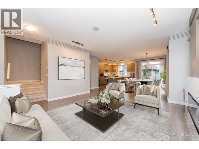 Outstanding opportunity to own this stunning, former SHOW HOME, end-unit at Polygon´s Kentwell. This 1680+ sq/ft, 4 bed 3 bath home is quietly nestled against serene greenery and boasts a beautiful open layout, with designer finishings and plenty of natural light. Designer extras include granite fireplace, custom built-in's, garage flooring and window treatments. Gourmet kitchen with modern appliances and central island, plus access to south facing balcony - perfect for hosting. Bright living and dining area, plus powder room on main. Up features 3 bedrooms, including the primary with WIC and spacious en-suite, plus side-by-side laundry. Down has a fourth bedroom /office, with custom built in´s and double car garage. Directly across from beautiful Riley Park. *Some photos virtually staged. (id:26452)