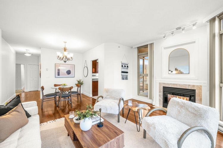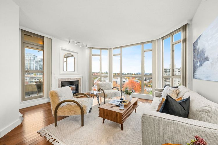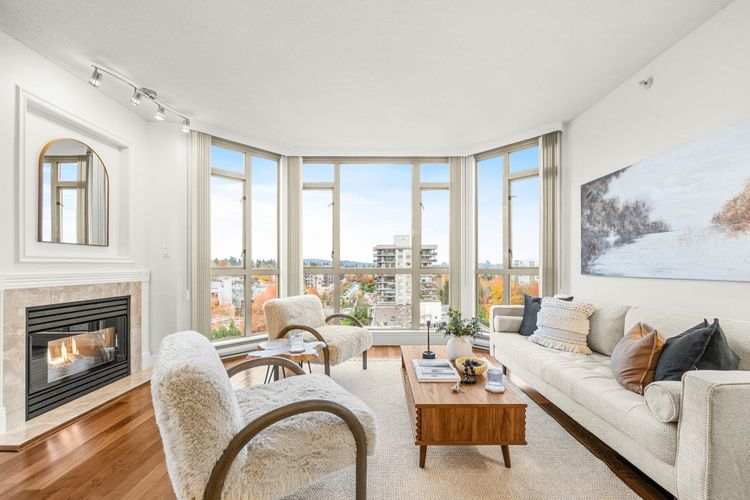 You’ll love this incredible corner suite at Victoria Park West with breathtaking 240° views from the North Shore Mountains to Burrard Inlet, Downtown Vancouver & Mt Baker—a panorama that glows w/ sunrise light & sparkles at night. This bright 2 bed, 2 bath home in a sought after concrete building beside beautiful Victoria Park features 9’ ceilings, floor-to-ceiling windows, hardwood floors & a layout that easily accommodates full sized furniture. Enjoy a bright kitchen w/ granite countertops & a cozy eat-in nook. Entertain guests in dining room or get cozy in living room w/ gas fireplace. Covered balcony perfect for morning coffee or sunset views. Freshly painted & move-in ready, with fitness centre, hot tub, sauna, guest suites & gardens. Steps to shops, restaurants, Shipyards, & SeaBus.