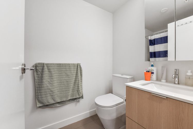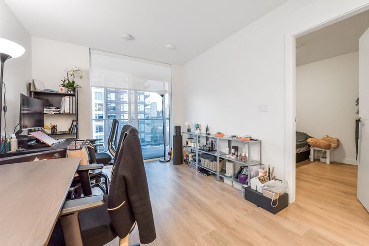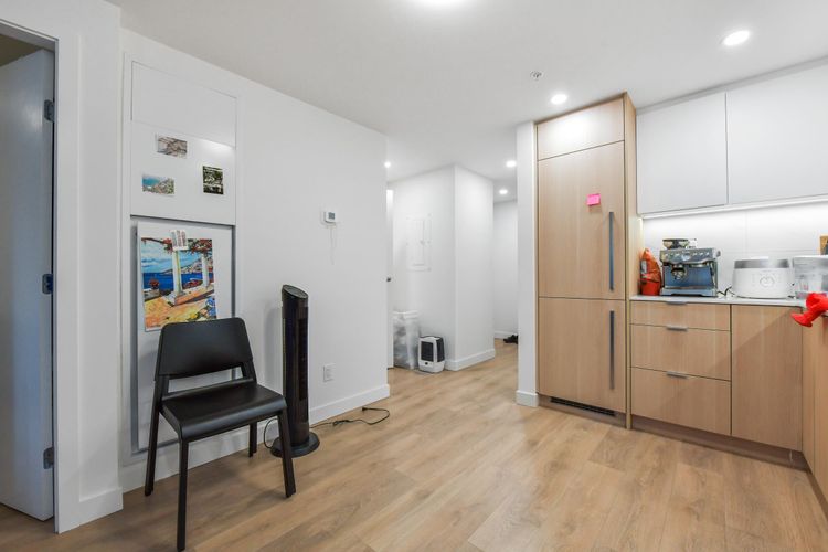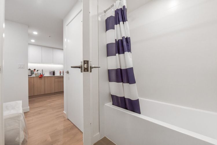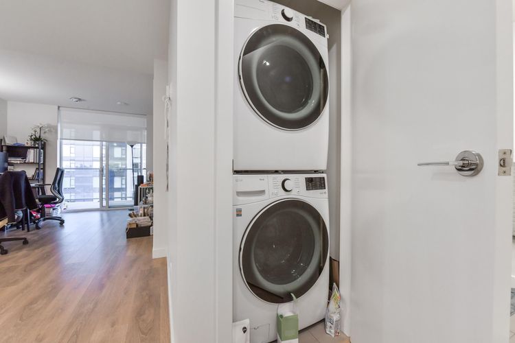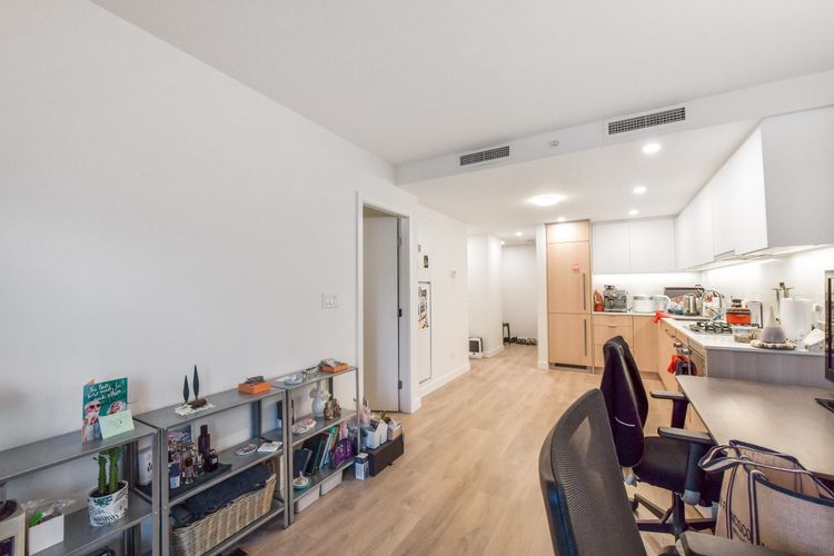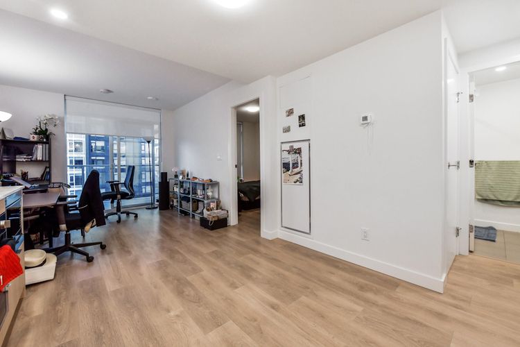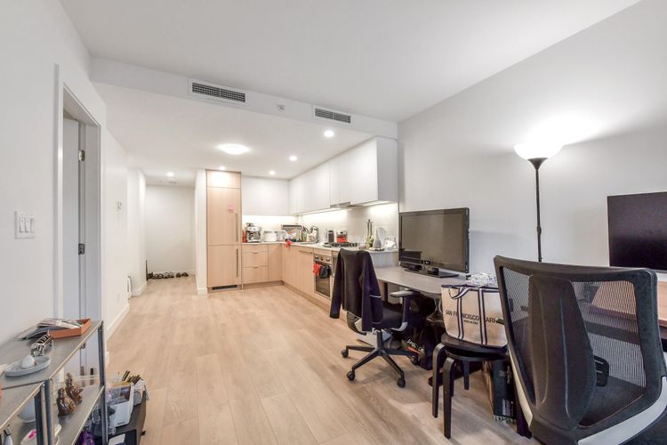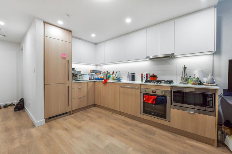 Welcome to SOCO by ANTHEM! This impressive North-facing 1 Bedroom + Den offers bright, open living with a spacious L-shaped kitchen featuring integrated 24" Bosch & Liebherr appliances, quartz countertops, and contemporary laminate flooring. Enjoy year-round comfort with an efficient heat pump providing both heating and cooling. Enjoy access to over 43,000 sq. ft. of indoor and outdoor amenities, including a fully equipped gym, yoga studio, lounge, basketball court, co-working spaces, music room workshop, outdoor BBQ area, badminton court, and table tennis.Located steps from H-Mart, Hannam Supermarket, restaurants, banks, and shopping, and just minutes to Lougheed SkyTrain Station and major highway routes for easy commuting. (id:26452)