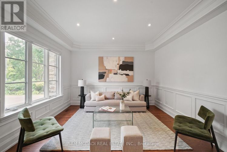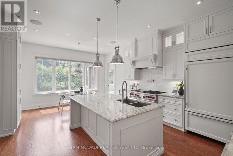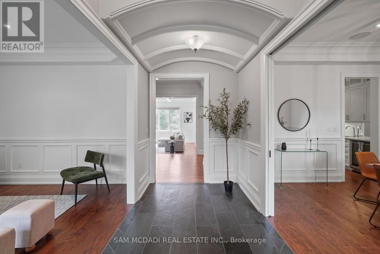 Welcome to this truly spectacular Mineola home. A true masterpiece nestled on a sprawling 90x150 ft lot on the highly desirable Maplewood Rd. An extraordinary commitment to craftsmanship and attention to detail, this residence offers 4,405 sqft of above-grade refined living space. Step through the gorgeous Mahogany entrance door and be immediately captivated by the breathtaking barrel vaulted foyer, adorned with exquisite plaster moulding. The main floor exudes elegance and functionality, featuring a beautiful family room with a stunning built-in gas fireplace, creating a warm and inviting atmosphere. Culinary enthusiasts will be delighted by the breathtaking eat-in kitchen, complemented by an adjacent butler's kitchen, perfect for entertaining. For seamless indoor-outdoor living, a bright, fully enclosed sunroom off the kitchen provides an ideal space for entertainment and leisure.The luxurious main floor primary bedroom suite is a private oasis, boasting a large walk-in closet with organizers and a lavish 5-piece spa-like ensuite, designed for ultimate relaxation. An additional bedroom and dedicated office space on the main floor offer exceptional convenience and versatility. Ascend to the second floor, where you'll find four generously sized bedrooms and two well-appointed bathrooms, providing ample space for family and guests. The finished lower level is an entertainer's paradise, featuring above-grade windows that flood the space with natural light. Enjoy a round of mini-golf, challenge friends to a game of billiards, or gather around the sleek wet bar, this basement is designed for endless fun and recreation, easily walk-up to the private backyard oasis. This must-see property is ideally located close to top-rated schools, lush parks, quick access to major highways, the Go-Train, and the vibrant Village of Port Credit, with its array of renowned restaurants and boutique shopping. Experience the pinnacle of luxury living in Mineola. (id:26452)