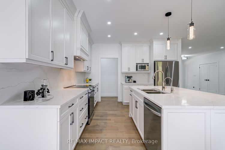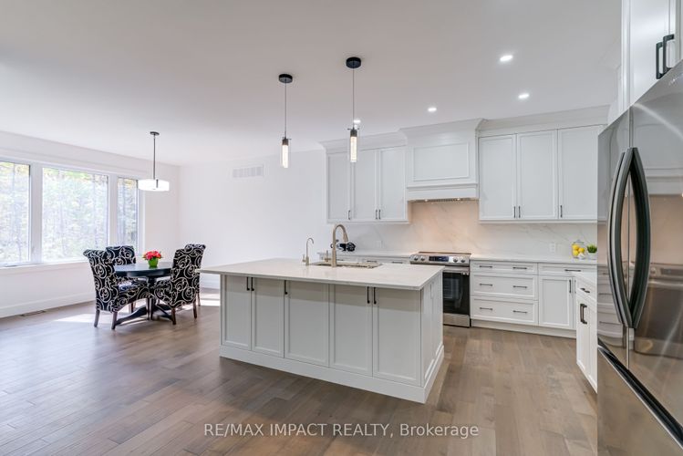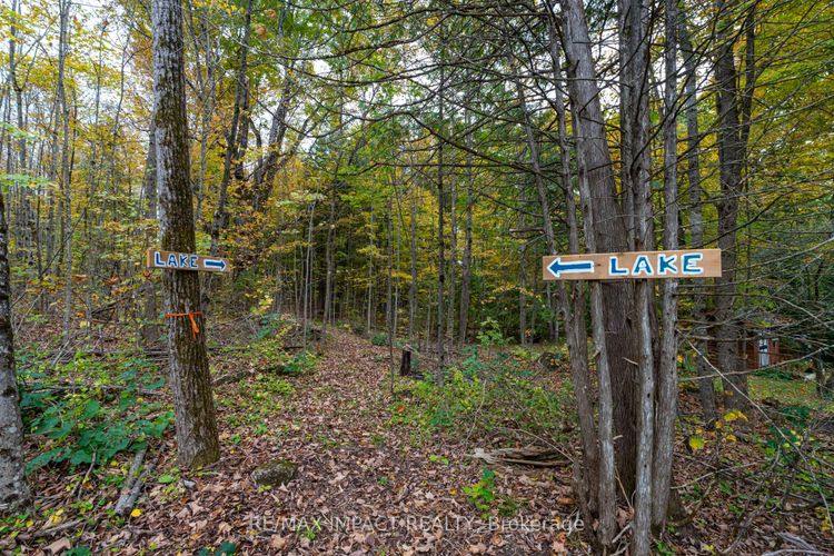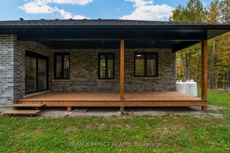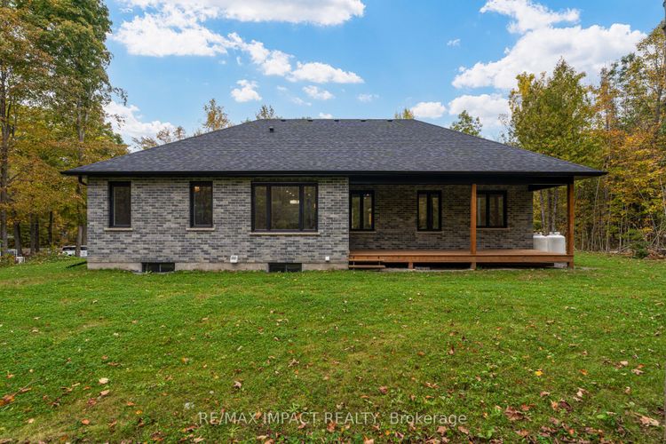 New custom-built home in the Buckhorn/Lakehurst area with deeded lake access to Pigeon Lake and the Trent System, being offered by the Builder, inclusive of Tarion New Home Warranty. This exceptional 2,036 sq ft bungalow offers 3 spacious bedrooms, 2 modern bathrooms and an oak staircase with black pickets leads to a full unspoiled basement with large windows awaiting your personal touch. Set on a private 0.80-acre lot surrounded by mature trees, this property provides ultimate privacy and tranquility. With lake access right from your backyard, you can walk to the water, soak in the waterfront lifestyle and the Seller is providing a 10 ft dock. The homes exterior showcases a striking combination of brick and stone, complemented by black trim accents and is framed by the natural beauty of the surrounding trees. A charming 22 ft covered front veranda with timber-frame construction and a beautifully crafted stone walkway invites you inside. At the back, a covered deck off the dining area offers a perfect spot for outdoor entertaining. Step inside to an open-concept layout filled with natural light. High ceilings, pot lights, engineered hardwood flooring and elegant porcelain tile set the tone throughout. The heart of the home is the stunning white kitchen, featuring black hardware, stainless steel appliances, quartz countertops and a stylish matching backsplash, all anchored by a large island with breakfast bar. The adjoining dining area and great room flow seamlessly, creating the ideal space for family gatherings. The thoughtfully designed layout places two secondary bedrooms and a main bath on one side of the home, while the luxurious primary suite, complete with a 5-piece ensuite and walk-in closet, enjoys privacy on the opposite side. Additional conveniences include main floor laundry with direct access to the attached double garage, which is fully drywalled and painted. (id:26452)
