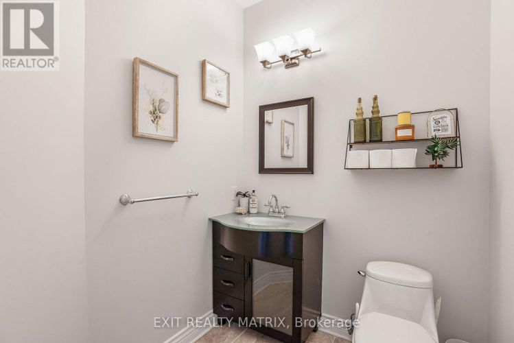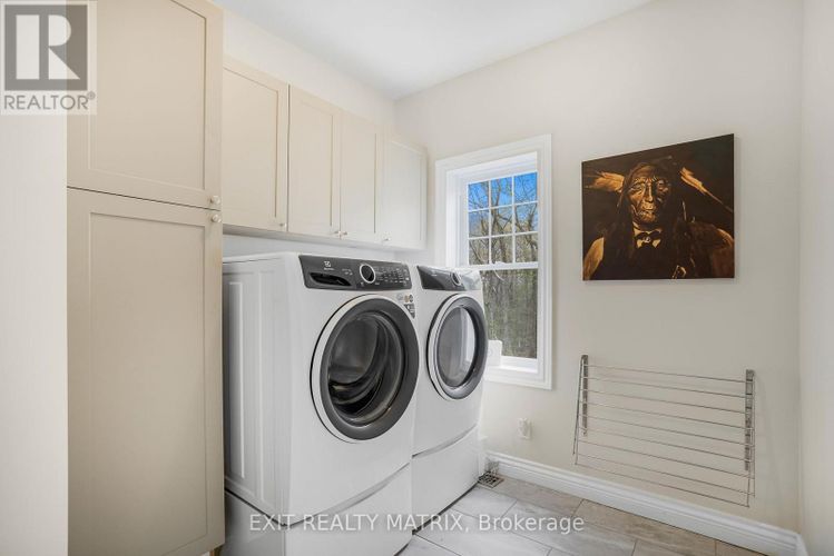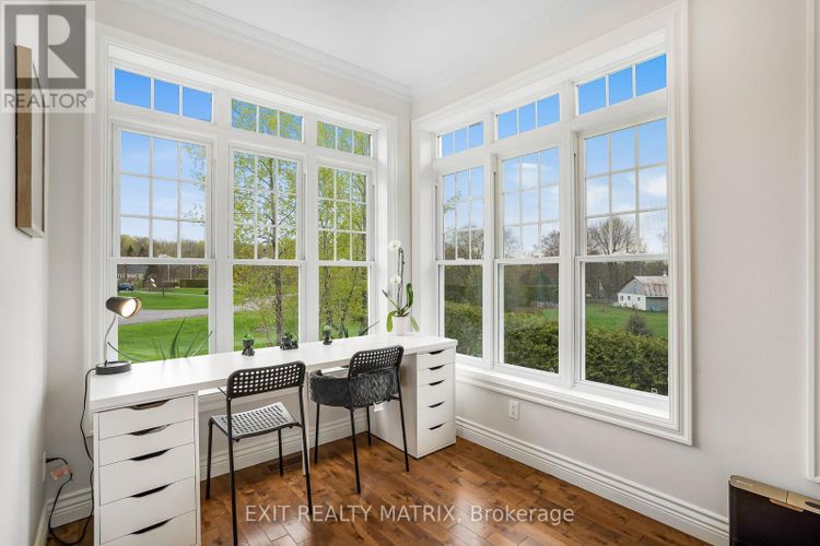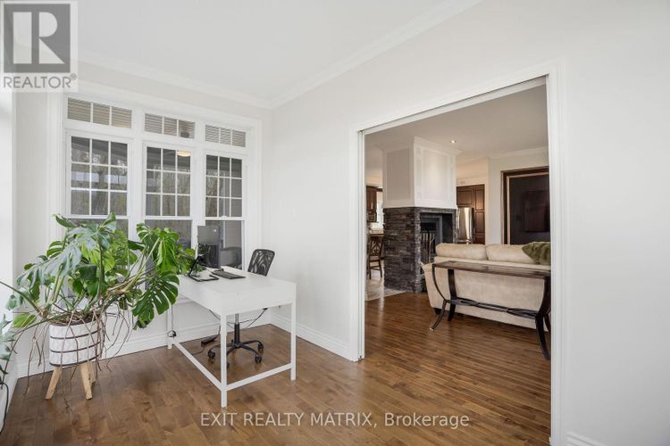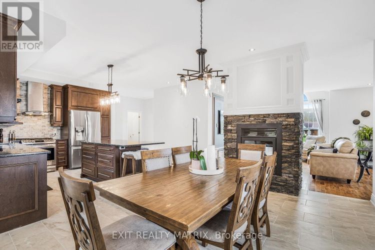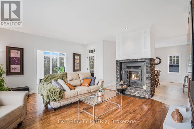 Welcome to this exceptional property, situated within a private and exclusive gated community in Hawkesbury, conveniently located across from the renowned Hawkesbury Golf & Curling Club. This executive residence offers refined living and features a breathtaking 30ft waterfall on its grounds, providing a serene and enchanting atmosphere. The spacious open-concept main floor includes a chefs kitchen equipped with granite countertops, cherry wood cabinetry, and a large center island, ideal for both entertaining and culinary endeavors. A striking double-sided wood-burning fireplace enhances the warmth and charm of the living and dining areas, creating an inviting ambiance. A dedicated laundry room and a stylish partial bathroom are also conveniently located on this level. The upper level comprises three well-appointed bedrooms, two of which provide direct access to a private balcony, perfect for enjoying morning coffee or evening sunsets. The luxurious primary suite features a spa-inspired ensuite with a deep, jetted tub, an elegant tiled shower, and an oversized walk-in closet. The fully finished basement expands the living space with two additional bedrooms, including a custom professionally built home studio and office, suitable for content creators or remote professionals. Furthermore, the basement includes a custom entertainment bar area with a 72 bottle capacity. The garage offers a professional golf simulator with a 20' x 24' four-hole putting green for golf enthusiasts. The exterior of the property offers a backyard oasis featuring a covered porch leading to a relaxing hot tub under a metal gazebo, meticulously manicured landscaping, a scenic path to the impressive Rideau Falls located on the property, and a cozy firepit area, providing a private retreat for all seasons. Over 3500 sq ft of finished living space. This exceptional offering combines executive comfort, natural beauty, and a prime location. (id:26452)