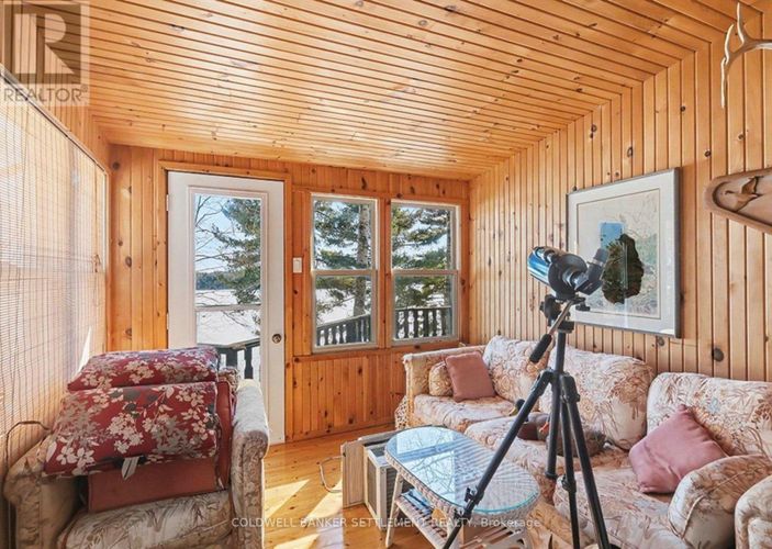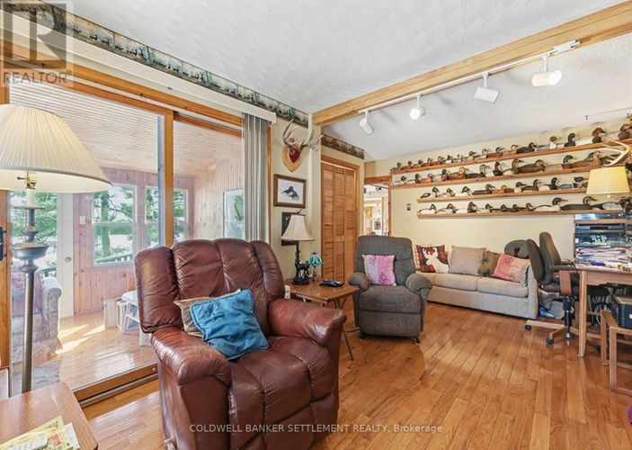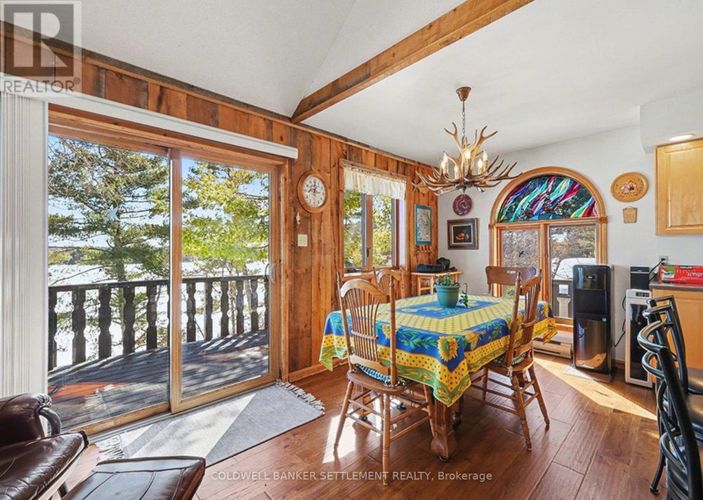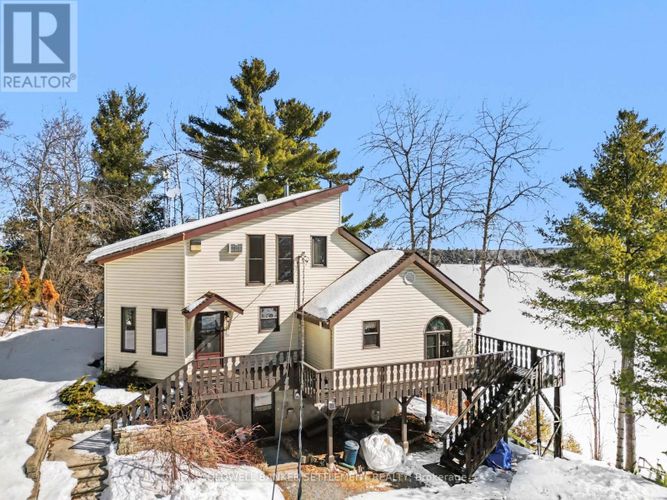 "Pike's Peak", as it is affectionately called by the Sellers, of this fantastic Pike Lake waterfront home and property. Located on a paved, 4 season road just seconds in off the Scotch Line Road midway between Perth & Westport and an hour to either Ottawa or Kingston. The tiered lot provides excellent access from the main level to a flat mid level area which then leads to plenty of good lakeside decking and dock area! The 154' of excellent waterfront provides for hours of enjoyment - swimming, boating and all the other fun recreational activities you would want to participate in on this spring fed, 782 acre lake. There are three levels of living space in the 2300 sq. ft. home. The ground level walks in from the driveway to a large foyer/storage space. Recreation room with pellet stove is ideal for a workout area, the laundry and storage/utility take up the balance of this level. Main level you will see a bright formal living room, large kitchen/dining with hardwood floors, maple cabinets, centre eat-up island, ceramic tile back splash & patio door to wrap around lakeside deck which also opens up to the main floor family room with warming woodstove. A spacious den/office could make a nice main floor bedroom with access to the lakeside 3 season sunroom. A full bath finishes off this level. Upper level sees a large primary bedroom with 3 piece ensuite & sauna, walk-in closet & built-ins, as well as 3 other good sized bedrooms (one has a lakeview balcony) . Extra features include vaulted ceilings & skylights, double detached garage, wood storage shed. (id:26452)